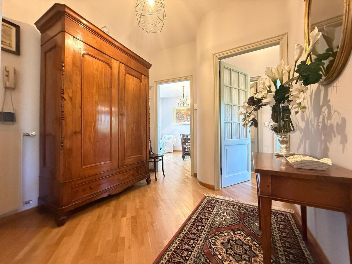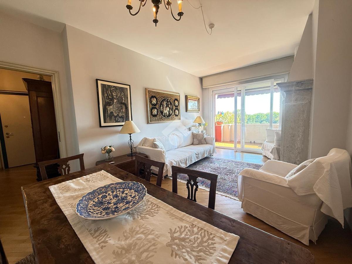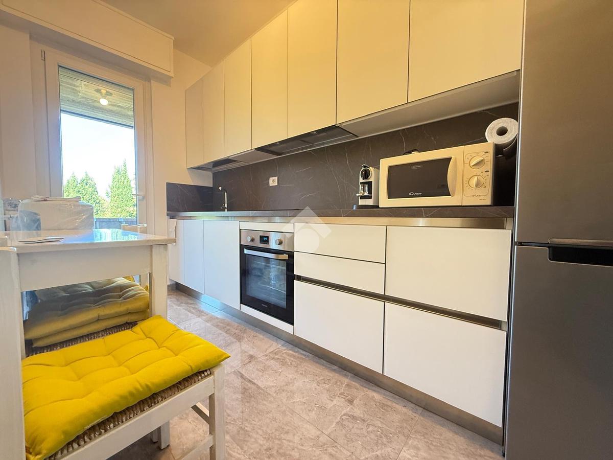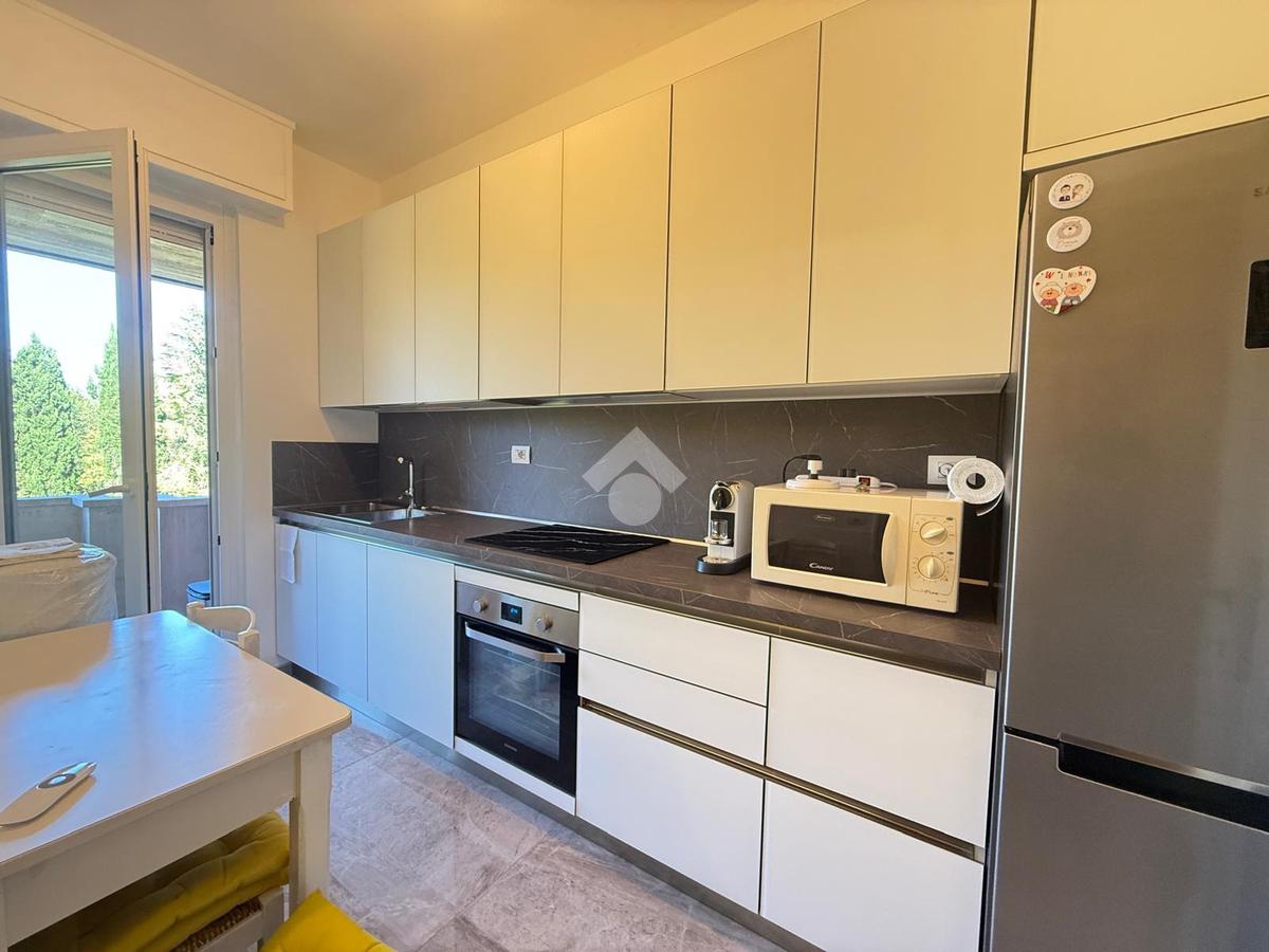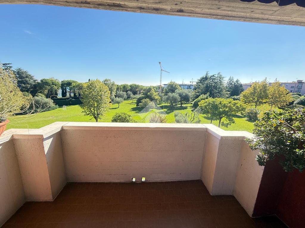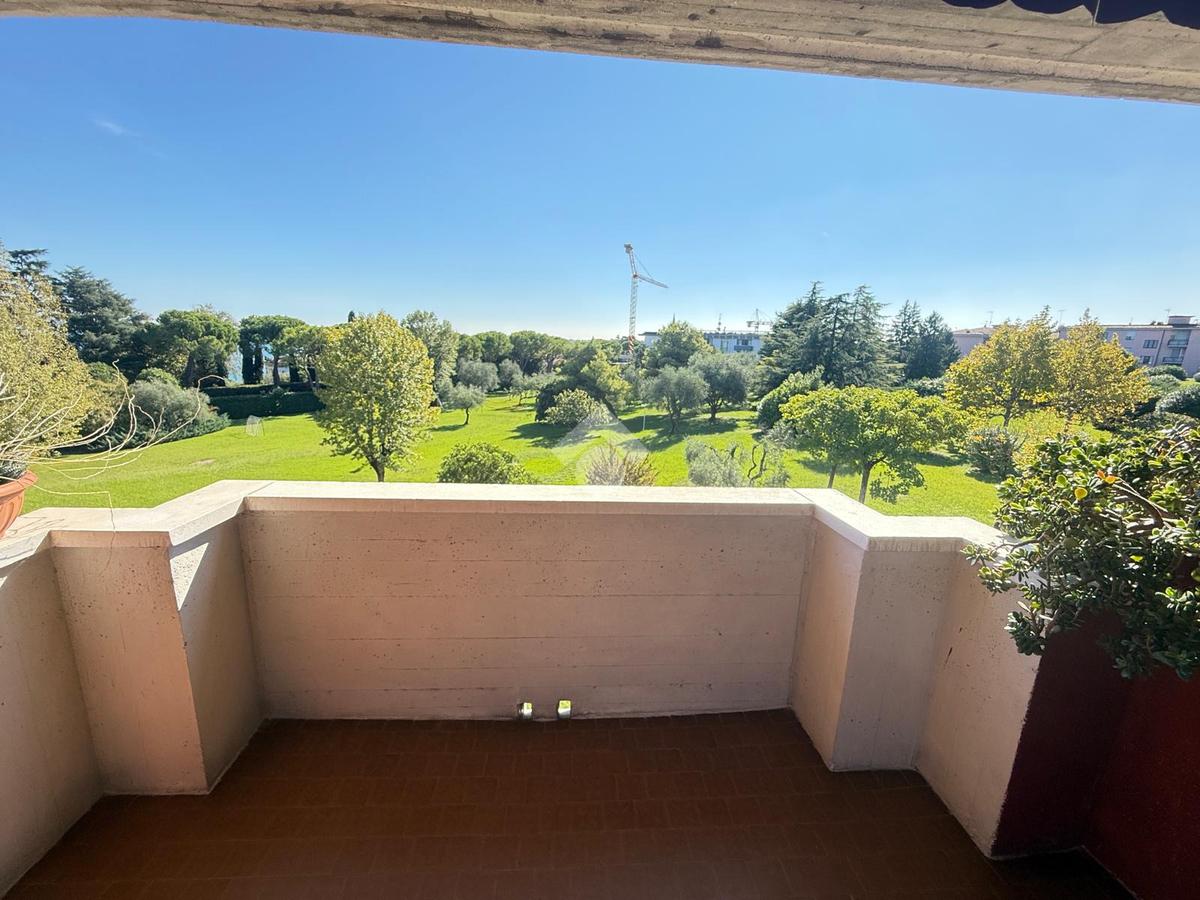 L'unità immobiliare in oggetto è stata recentemente ristrutturata e si presenta in ottime condizioni manutentive. L'ingresso apre direttamente sulla zona living affacciata sul grande terrazzo con vista sul parco e con scorcio di vista lago. La cucina è separata, abitabile e dotata di porta finestra con accesso al balcone. La zona notte ospita le due camere da letto e i due servizi (di cui il principale è stato rinnovato nel 2023). Le camere dispongono di secondo balcone dal quale si può godere di vista sul parco, sulla piscina e sul lago.
