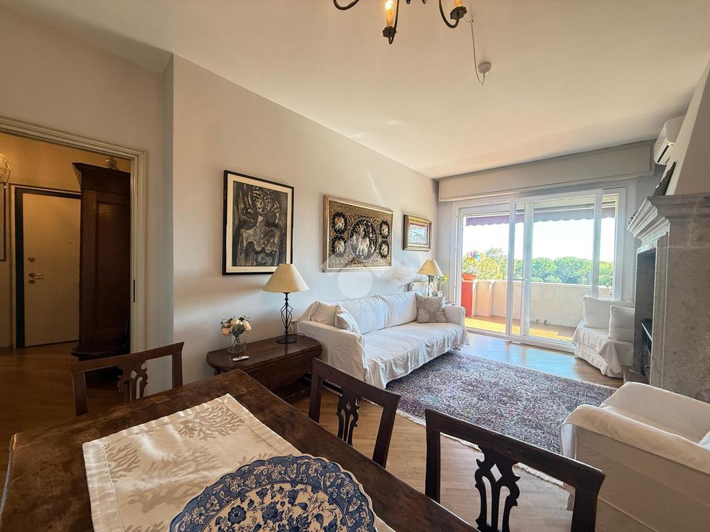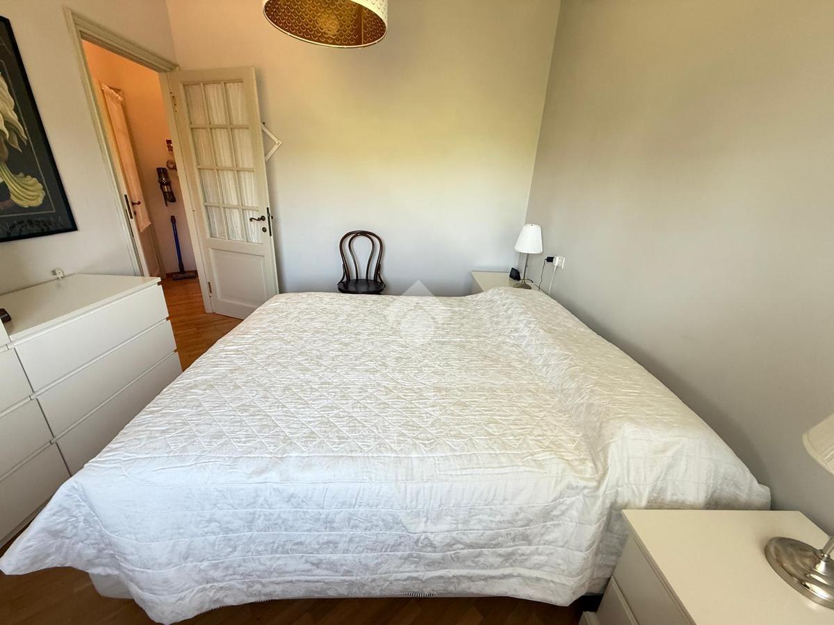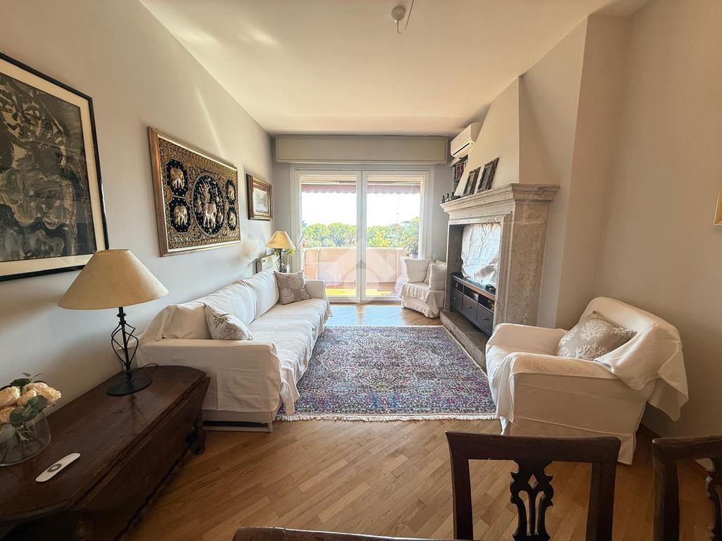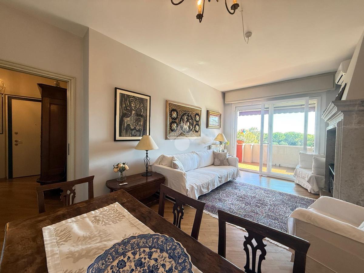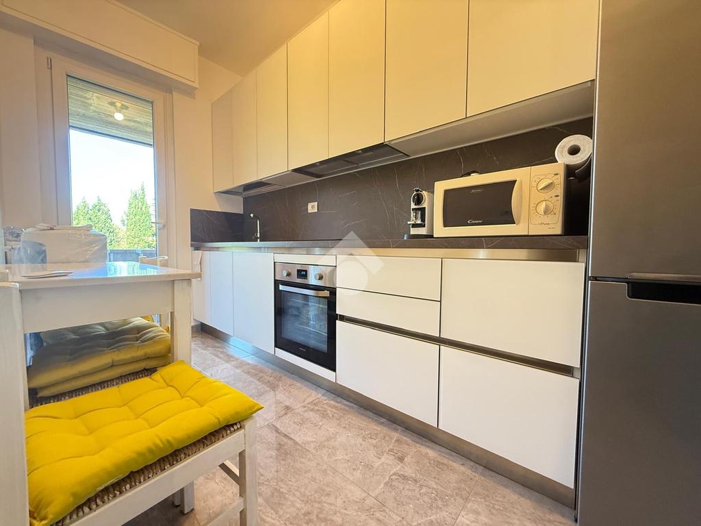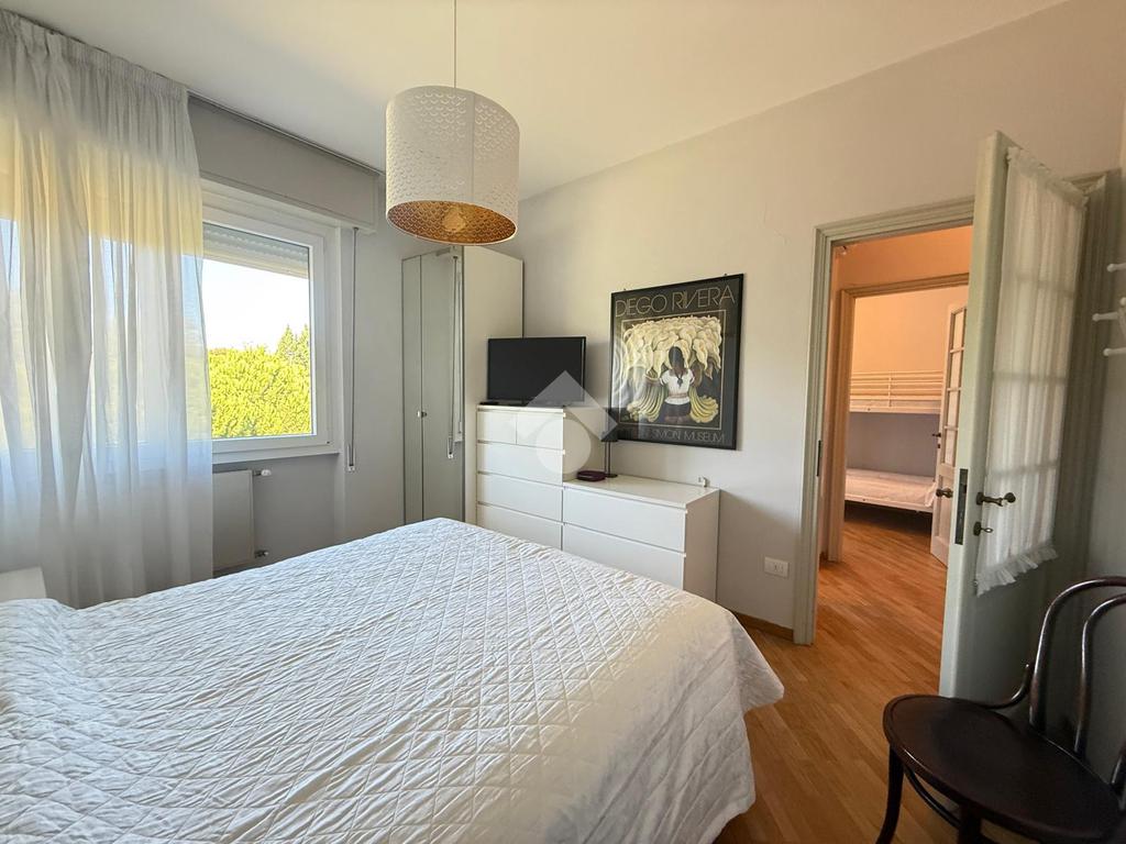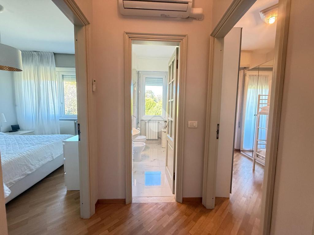 L'unità immobiliare in oggetto è stata recentemente ristrutturata e si presenta in ottime condizioni manutentive. L'ingresso apre direttamente sulla zona living affacciata sul grande terrazzo con vista sul parco e con scorcio di vista lago. La cucina è separata, abitabile e dotata di porta finestra con accesso al balcone. La zona notte ospita le due camere da letto e i due servizi (di cui il principale è stato rinnovato nel 2023). Le camere dispongono di secondo balcone dal quale si può godere di vista sul parco, sulla piscina e sul lago.