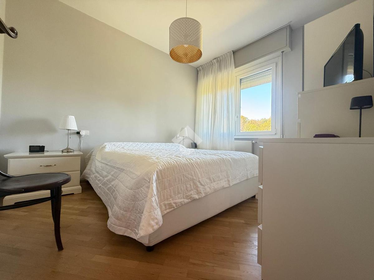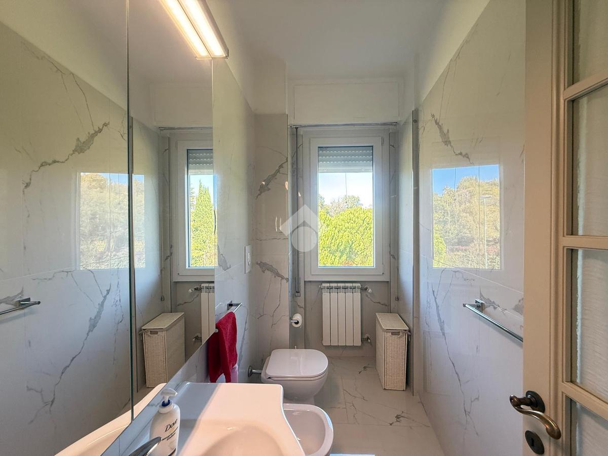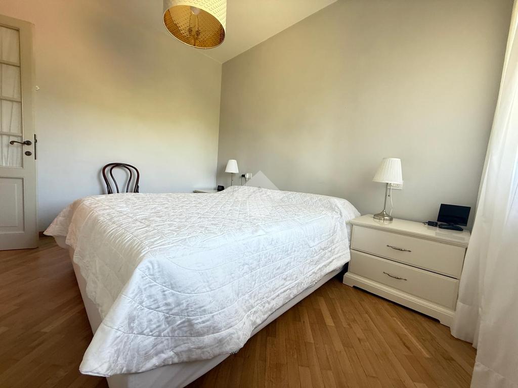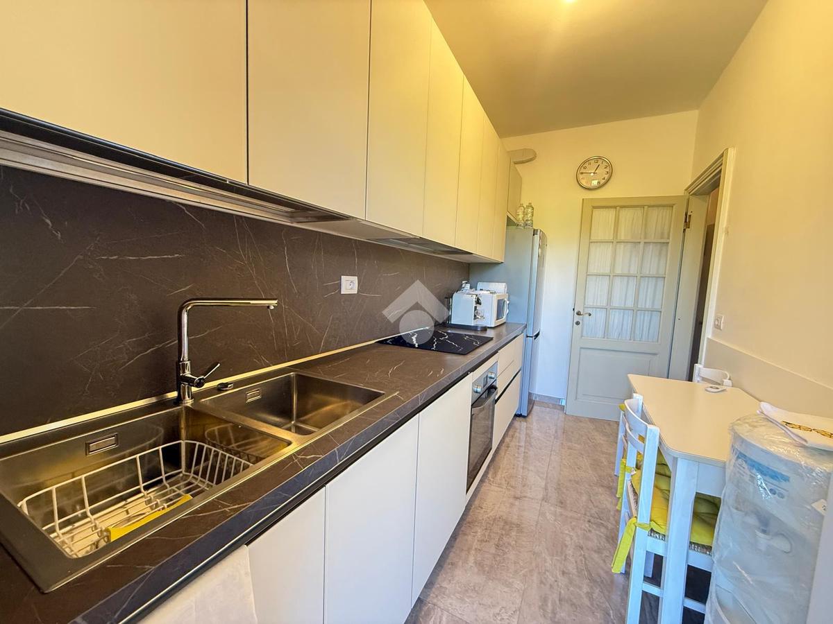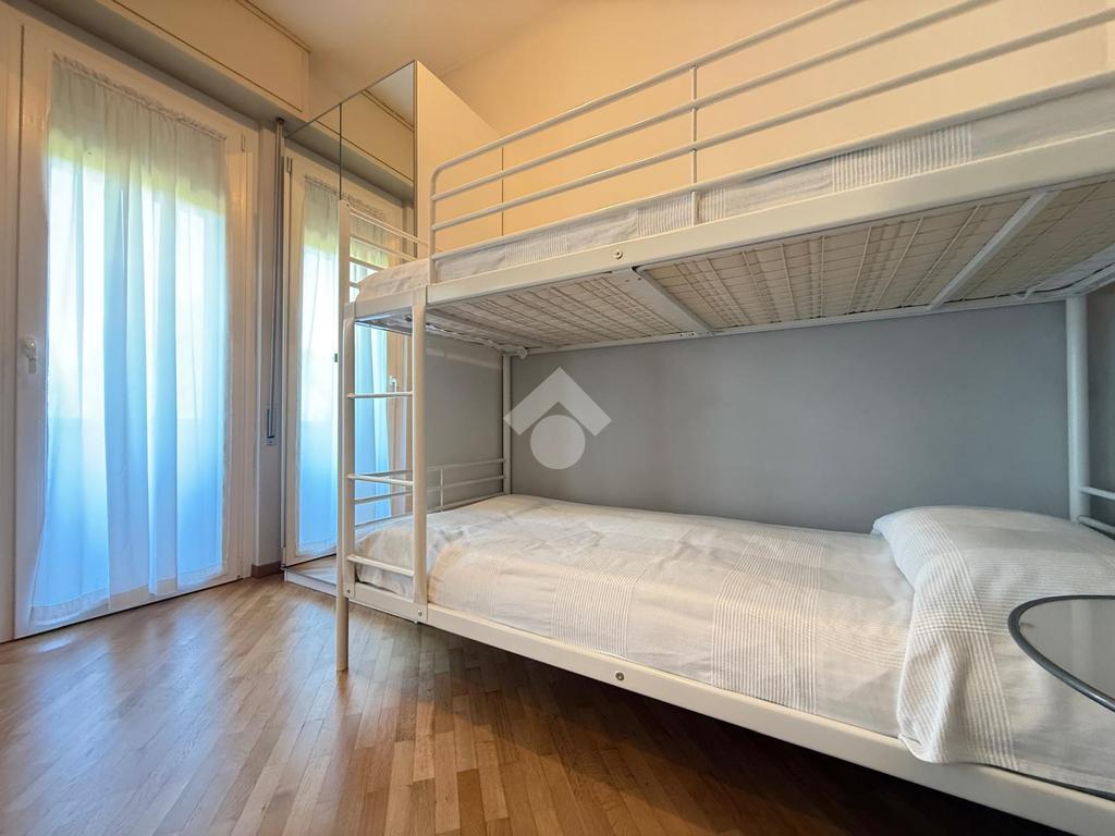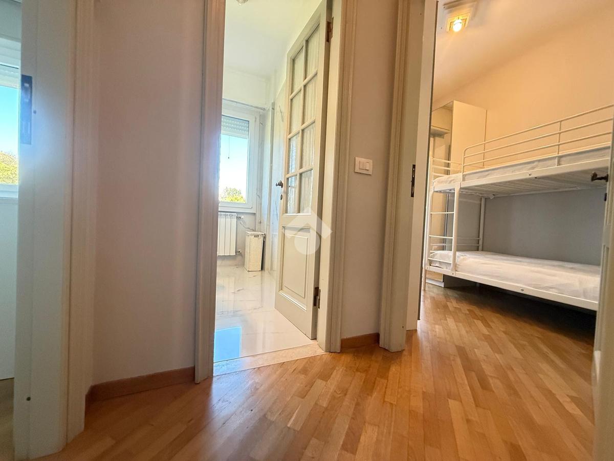 L'unità immobiliare in oggetto è stata recentemente ristrutturata e si presenta in ottime condizioni manutentive. L'ingresso apre direttamente sulla zona living affacciata sul grande terrazzo con vista sul parco e con scorcio di vista lago. La cucina è separata, abitabile e dotata di porta finestra con accesso al balcone. La zona notte ospita le due camere da letto e i due servizi (di cui il principale è stato rinnovato nel 2023). Le camere dispongono di secondo balcone dal quale si può godere di vista sul parco, sulla piscina e sul lago.