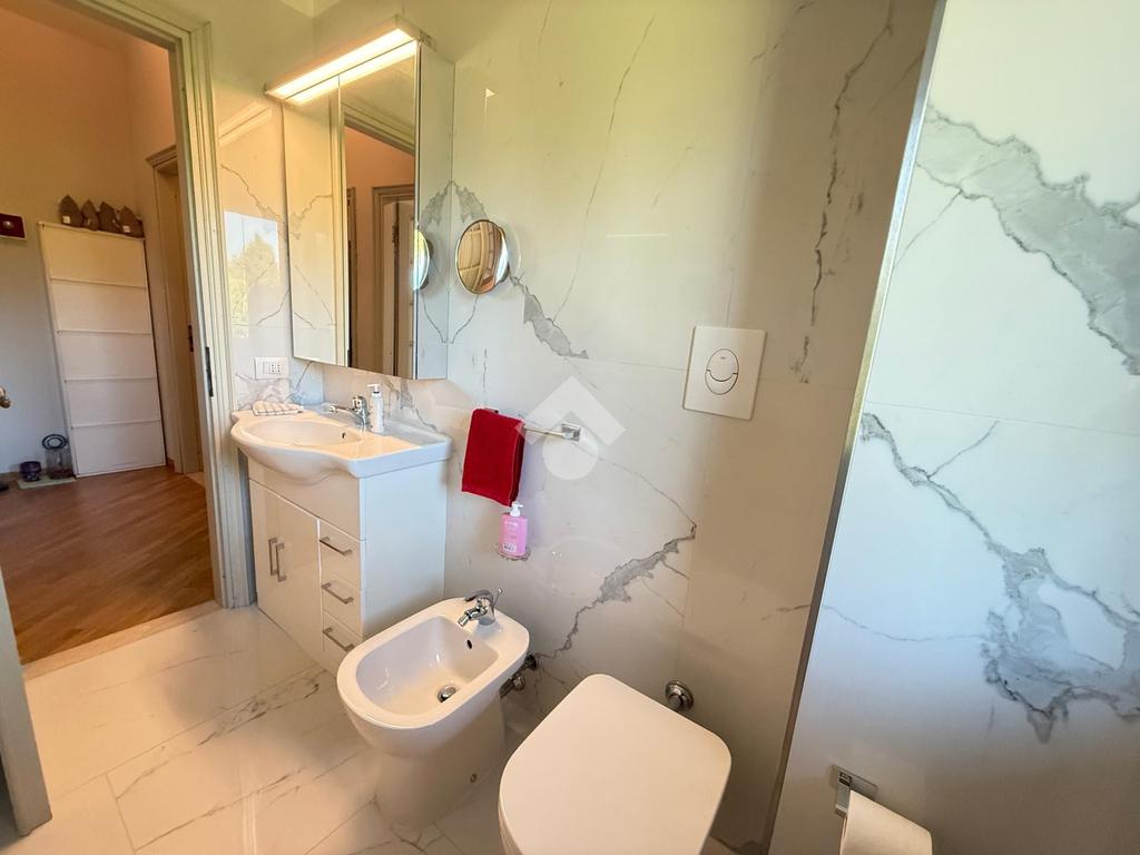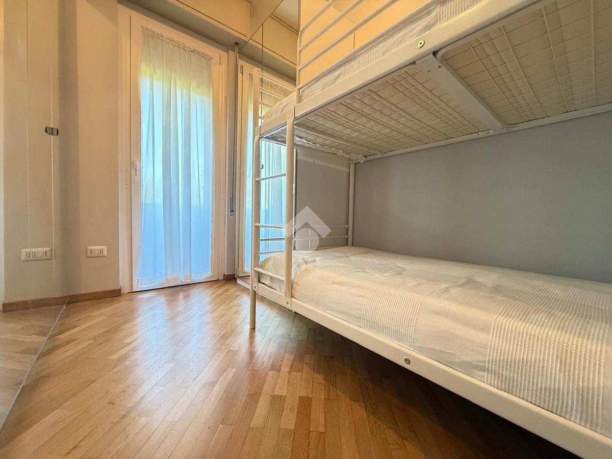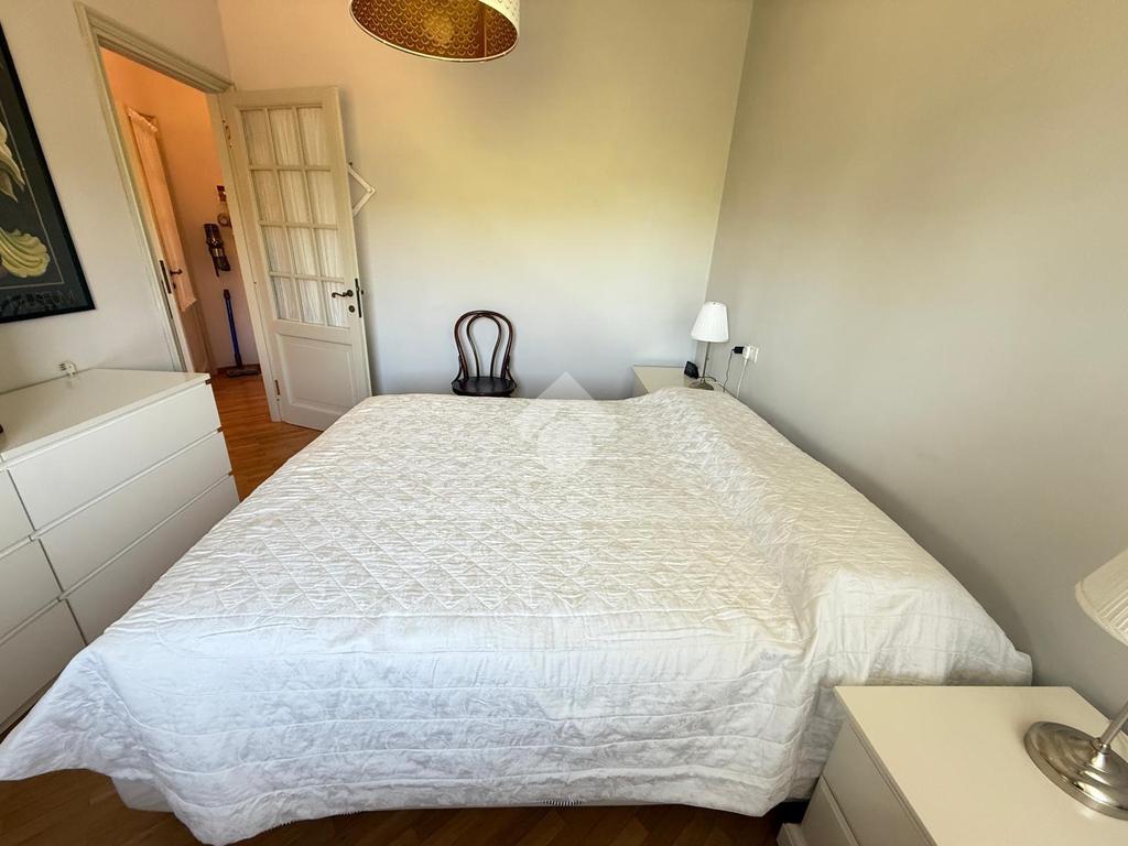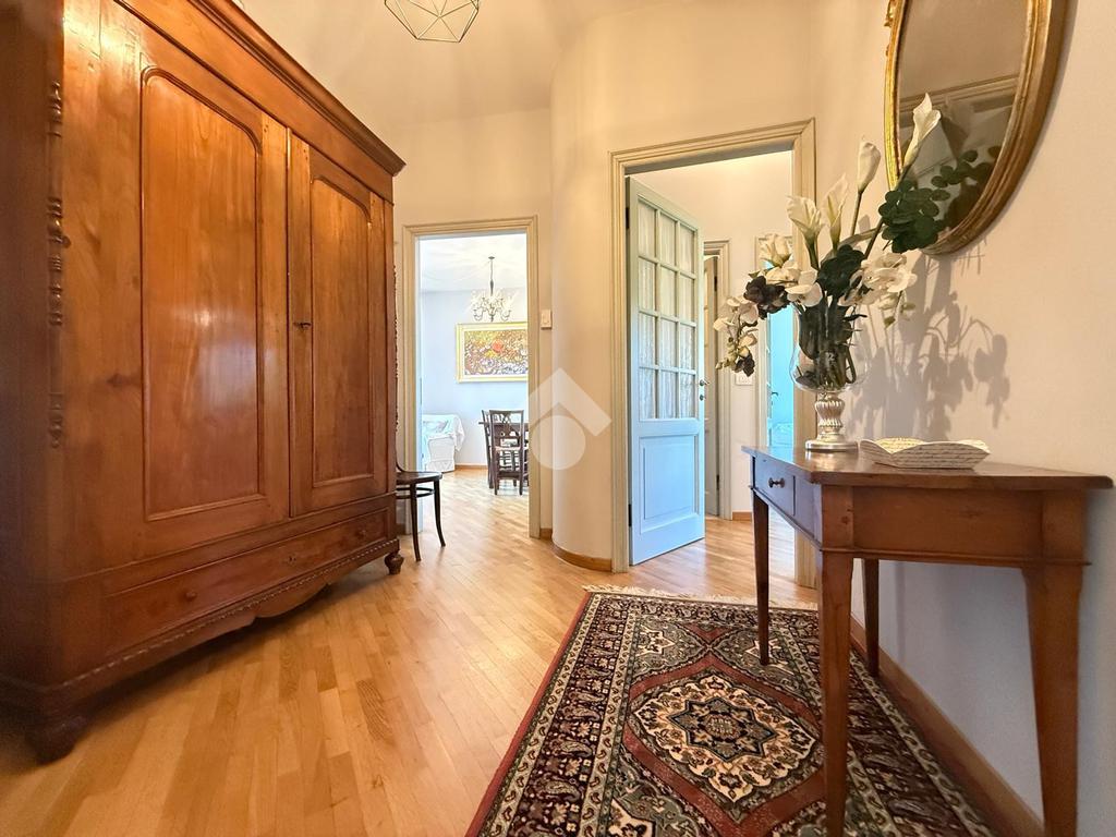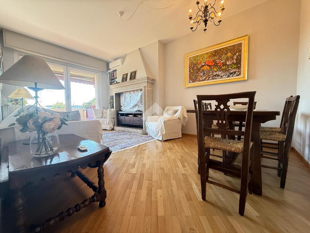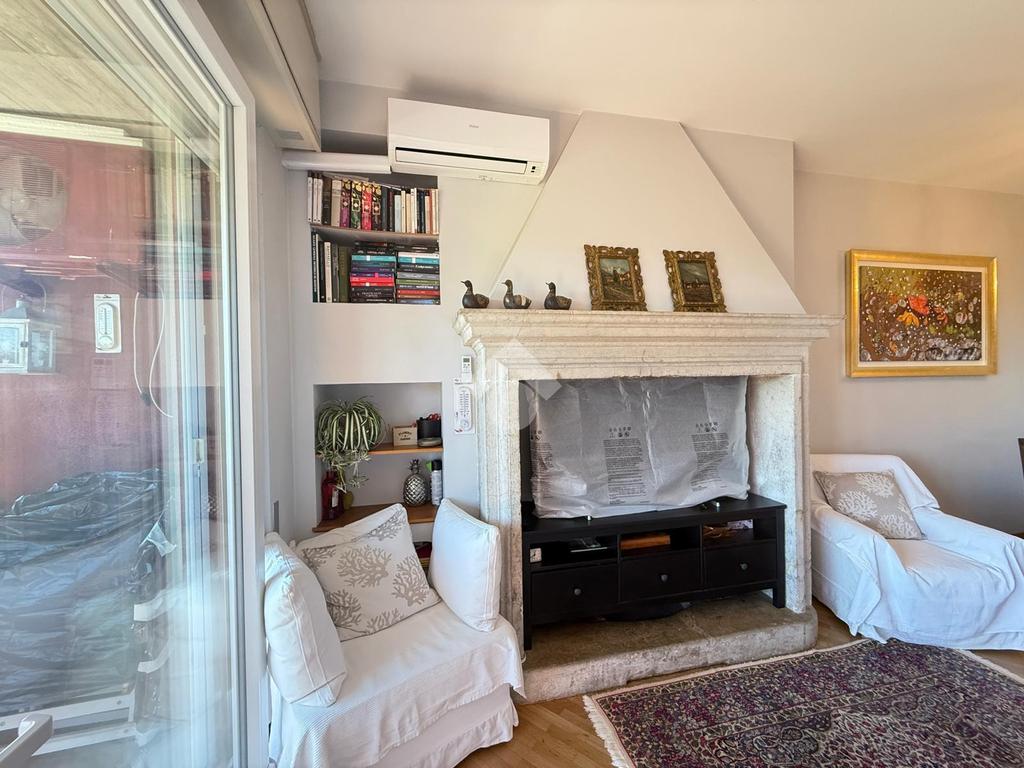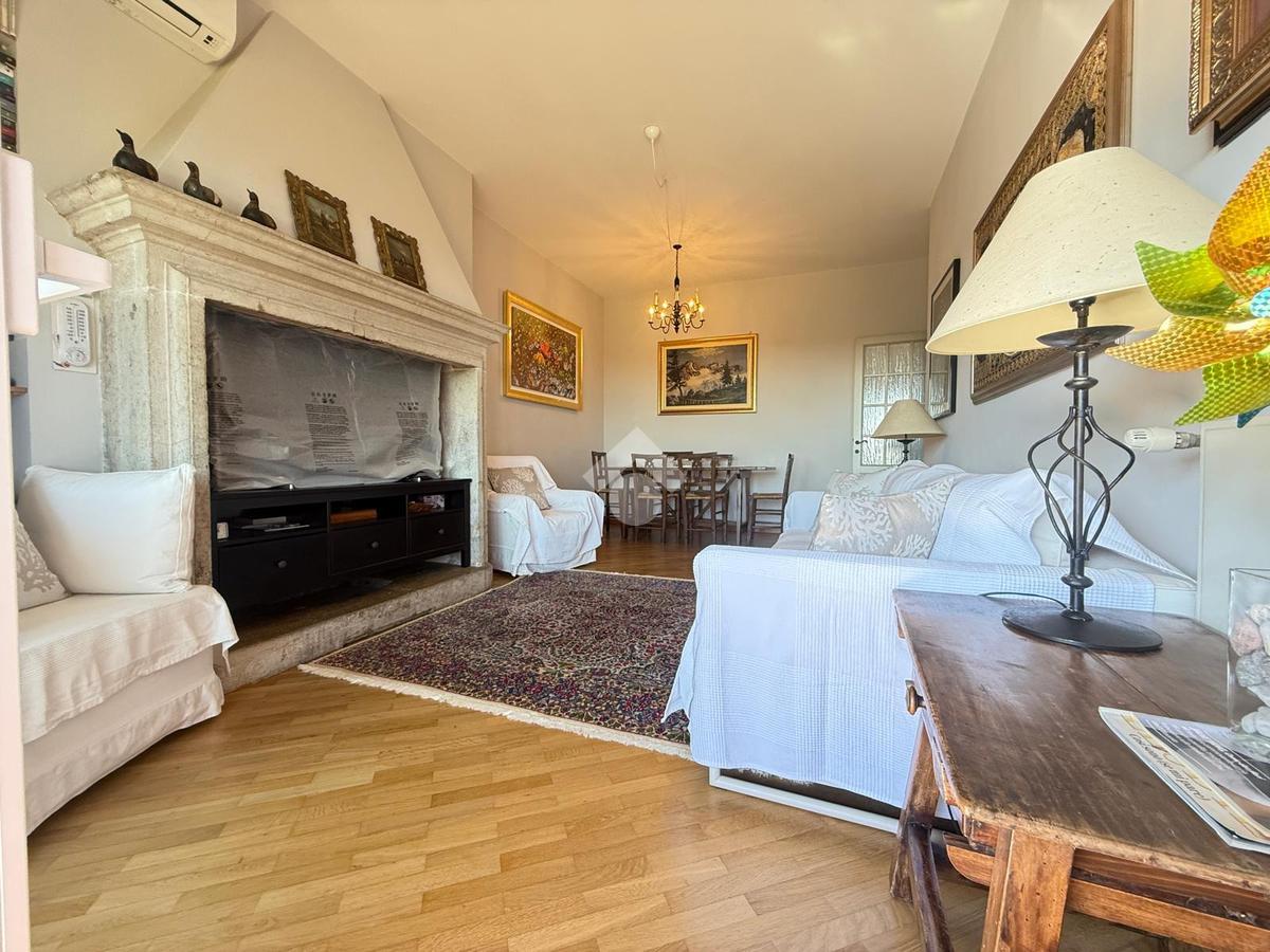 L'unità immobiliare in oggetto è stata recentemente ristrutturata e si presenta in ottime condizioni manutentive. L'ingresso apre direttamente sulla zona living affacciata sul grande terrazzo con vista sul parco e con scorcio di vista lago. La cucina è separata, abitabile e dotata di porta finestra con accesso al balcone. La zona notte ospita le due camere da letto e i due servizi (di cui il principale è stato rinnovato nel 2023). Le camere dispongono di secondo balcone dal quale si può godere di vista sul parco, sulla piscina e sul lago.