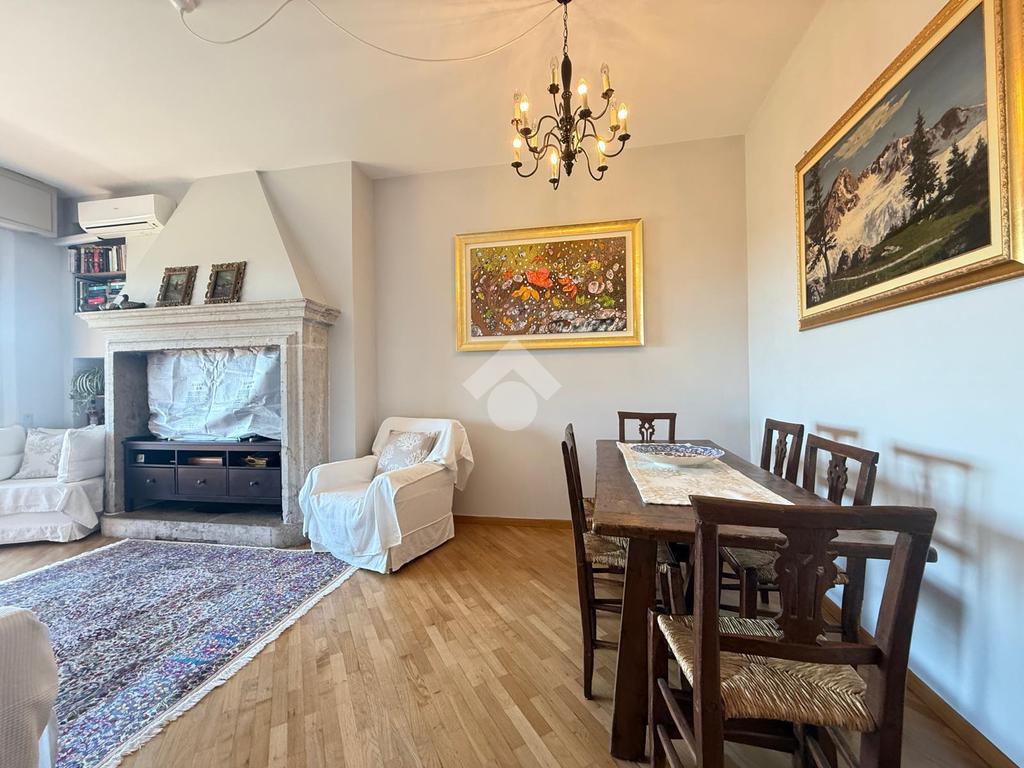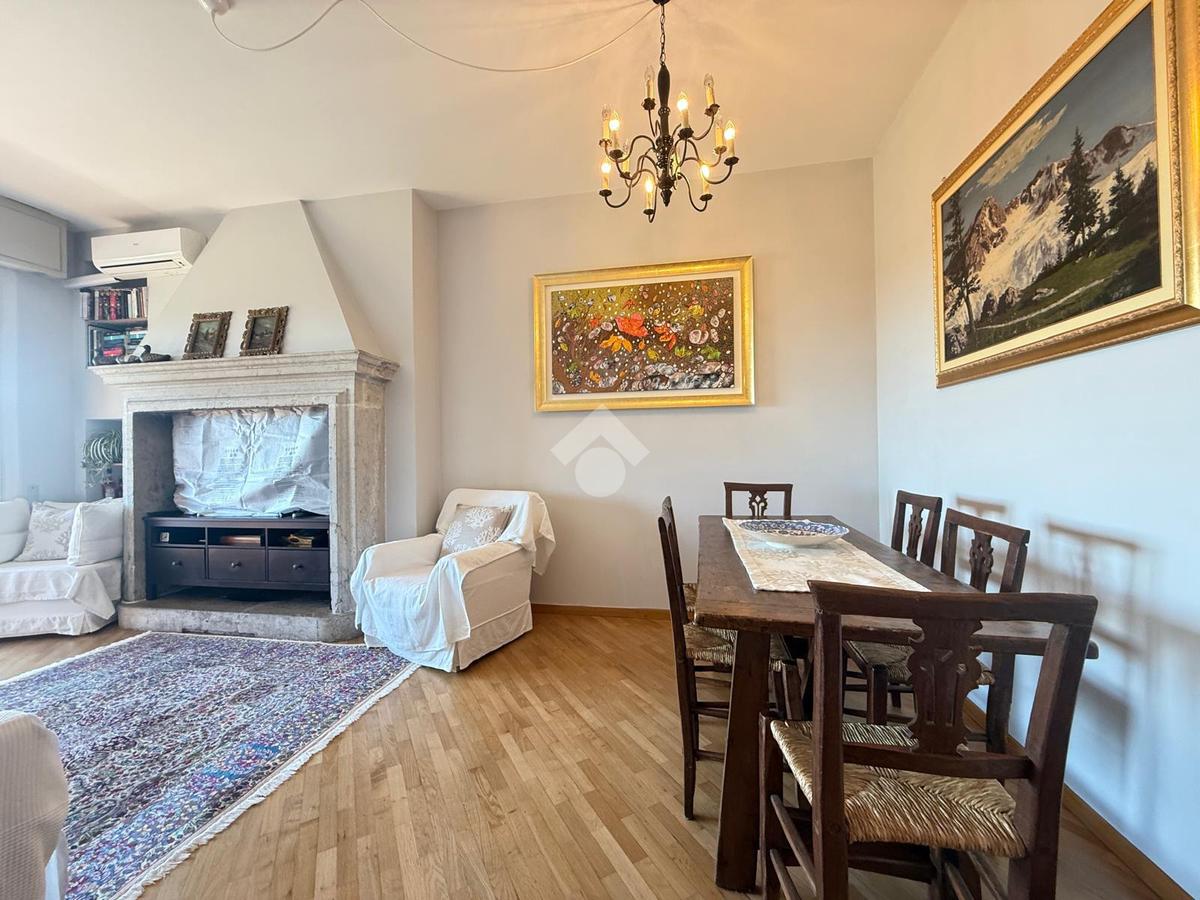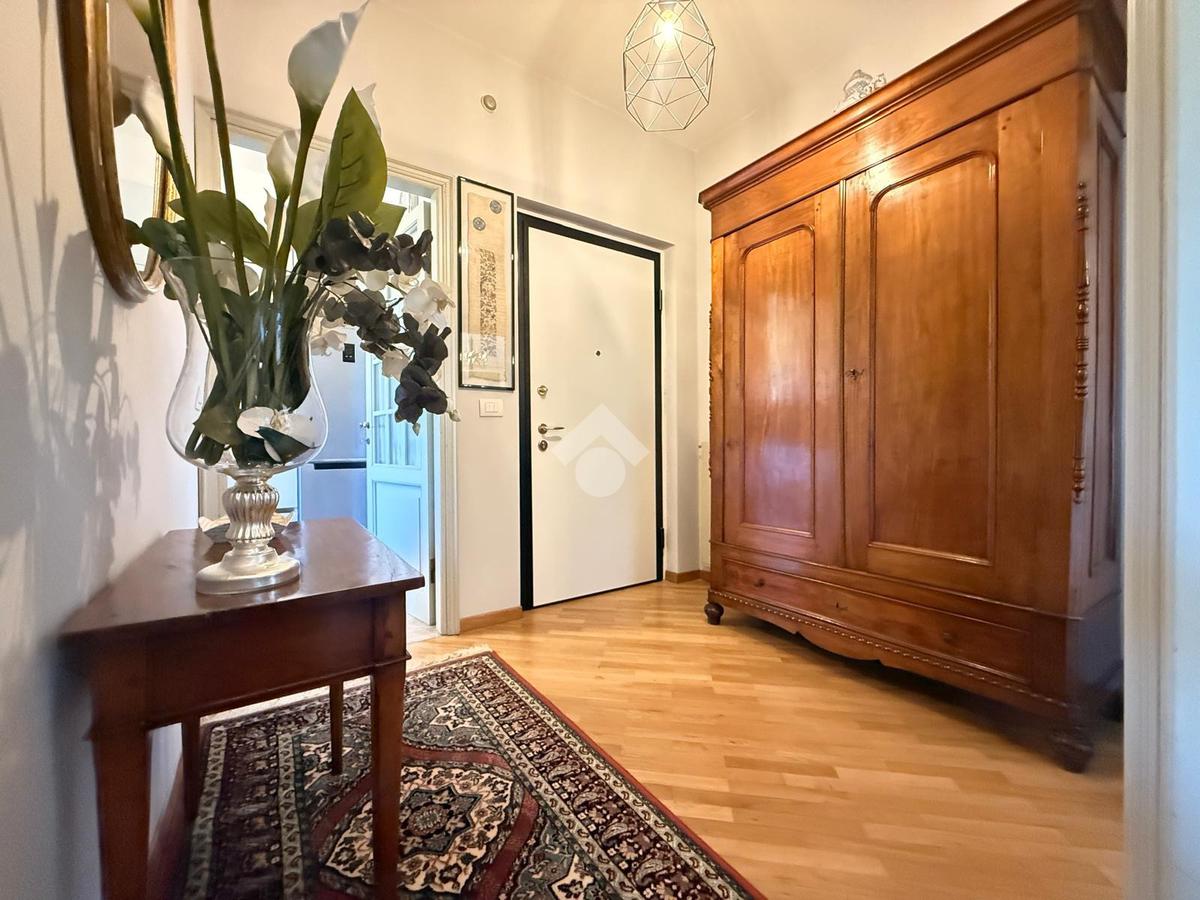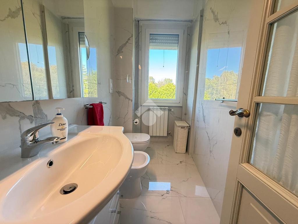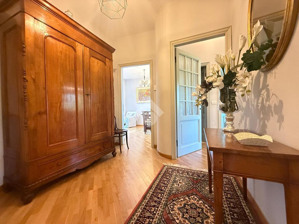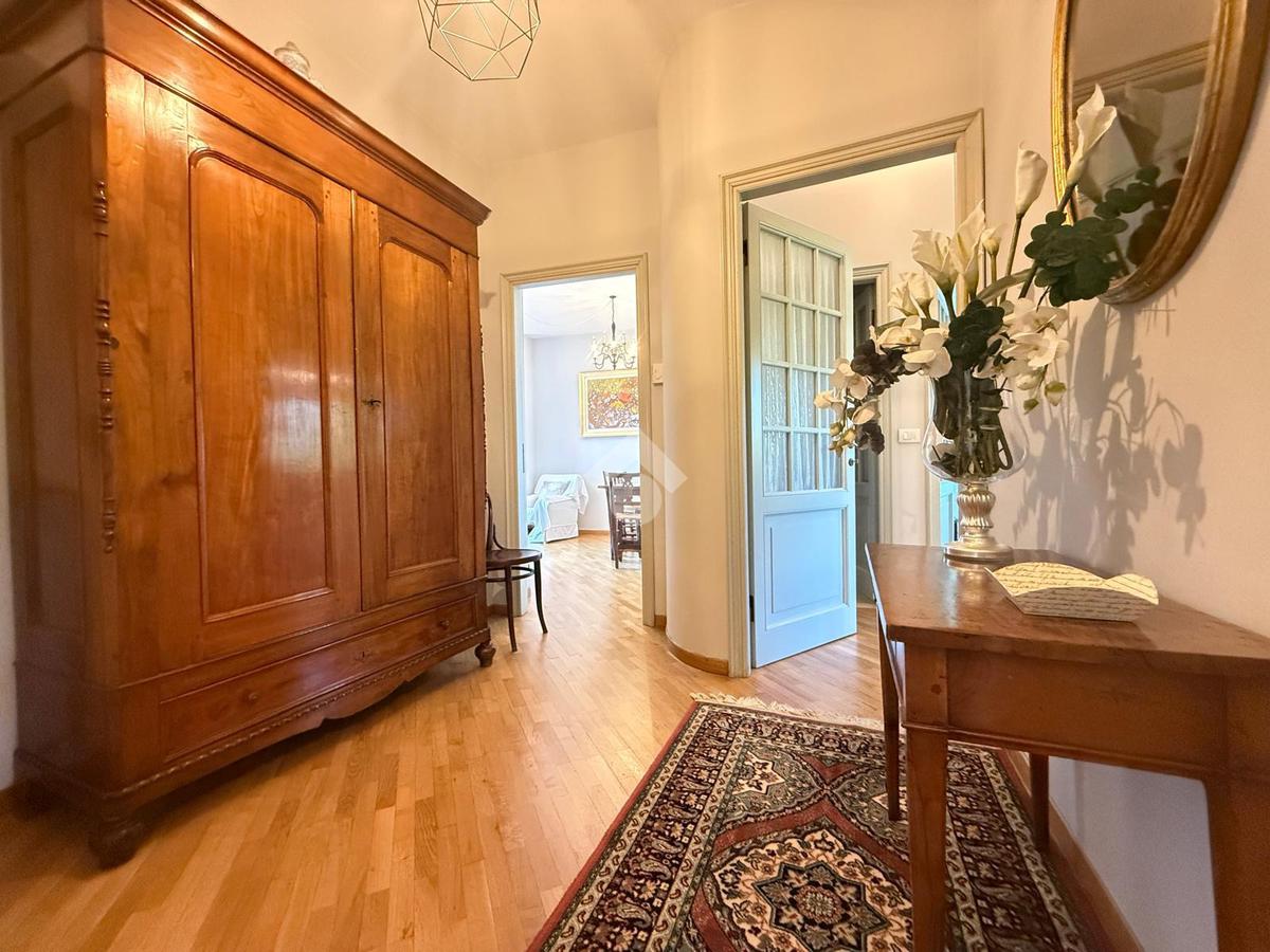 L'unità immobiliare in oggetto è stata recentemente ristrutturata e si presenta in ottime condizioni manutentive. L'ingresso apre direttamente sulla zona living affacciata sul grande terrazzo con vista sul parco e con scorcio di vista lago. La cucina è separata, abitabile e dotata di porta finestra con accesso al balcone. La zona notte ospita le due camere da letto e i due servizi (di cui il principale è stato rinnovato nel 2023). Le camere dispongono di secondo balcone dal quale si può godere di vista sul parco, sulla piscina e sul lago.