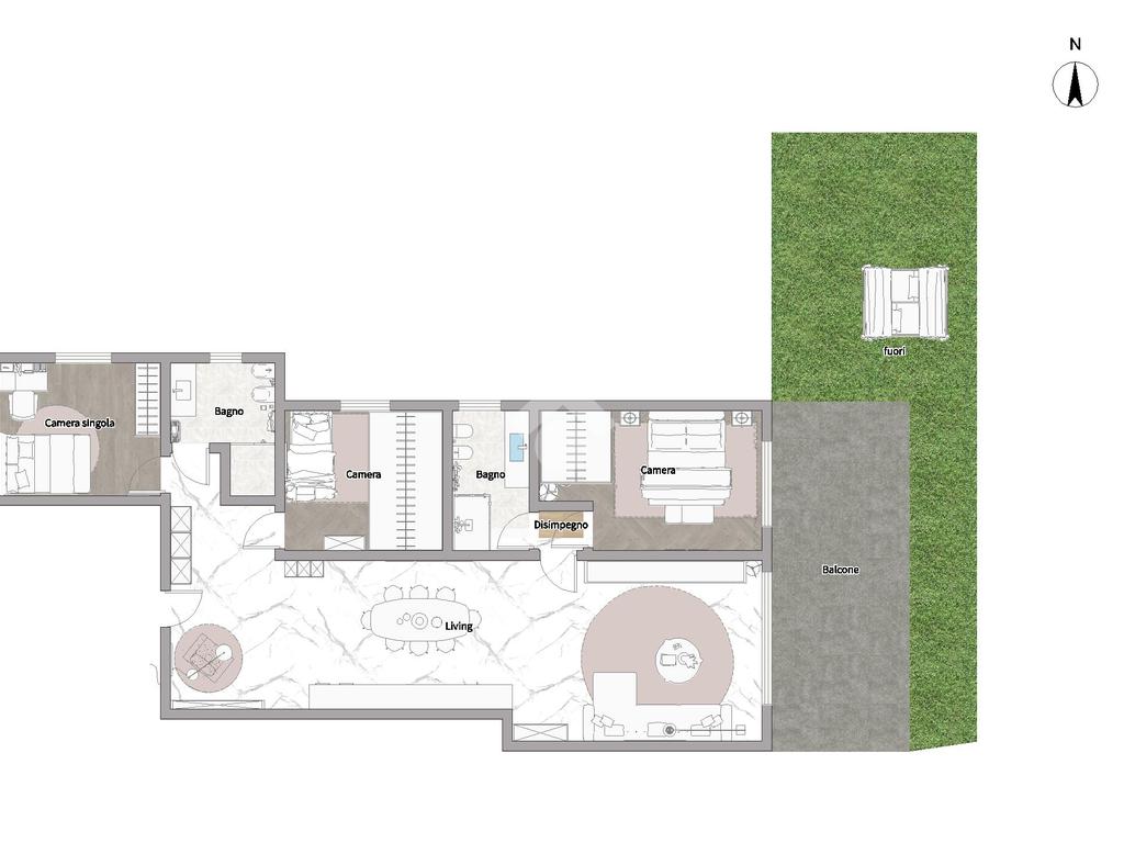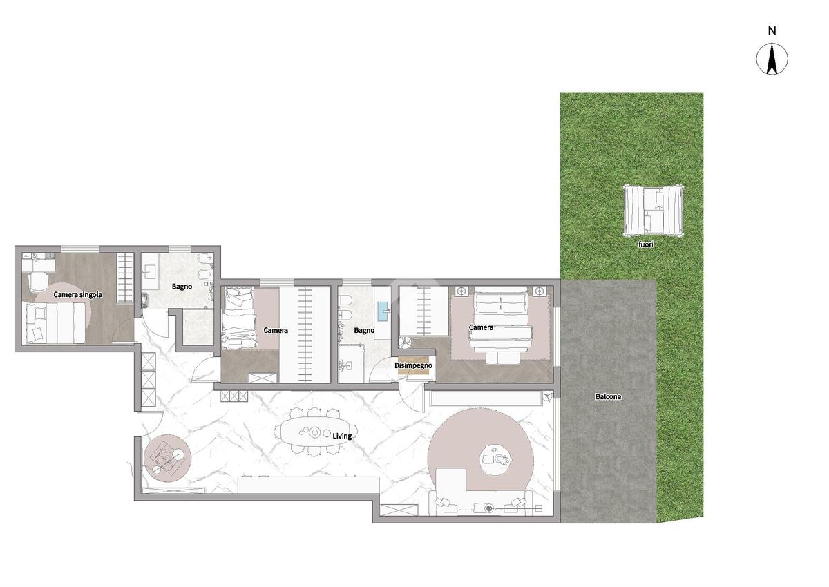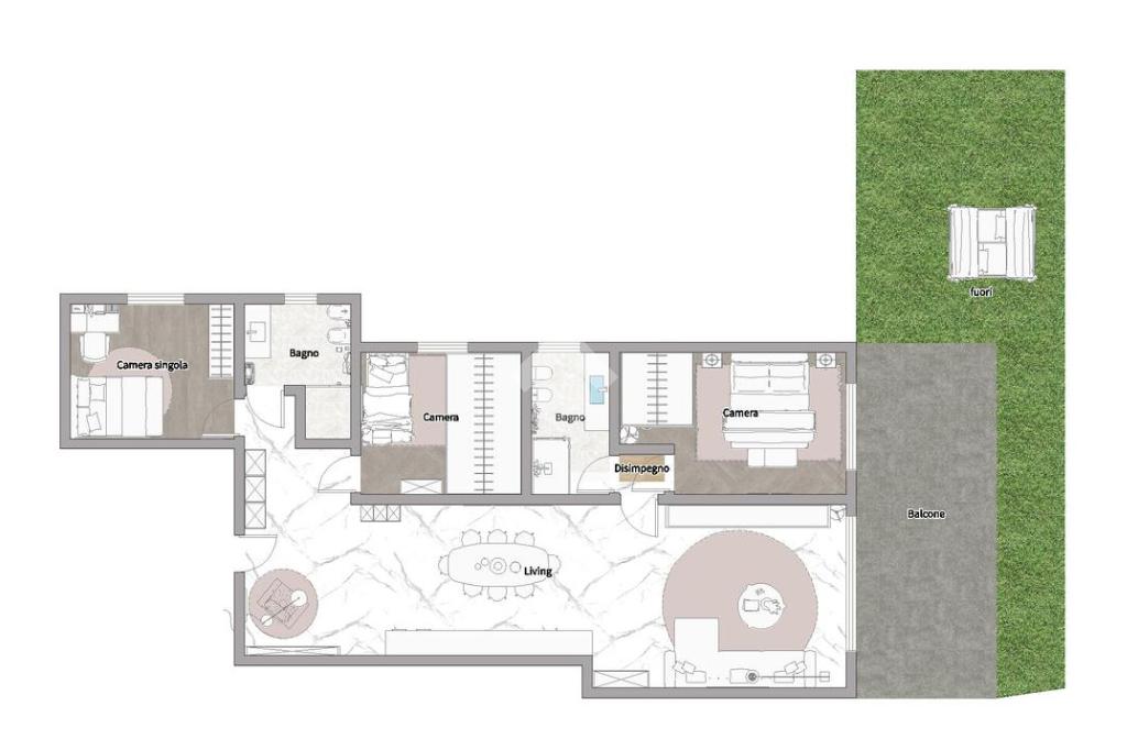 L’appartamento si trova al piano terra e offre spazi ampi e funzionali, ideali per vivere a contatto con la natura senza rinunciare al comfort. La zona giorno, luminosa e accogliente, prevede la possibilità di separare la cucina e si apre su una loggia coperta che affaccia sul giardino privato, perfetto per momenti di relax all’aperto in totale riservatezza. La zona notte è composta da una camera matrimoniale, una camera doppia, una camera singola, due bagni e due garage affiancati al piano interrato.