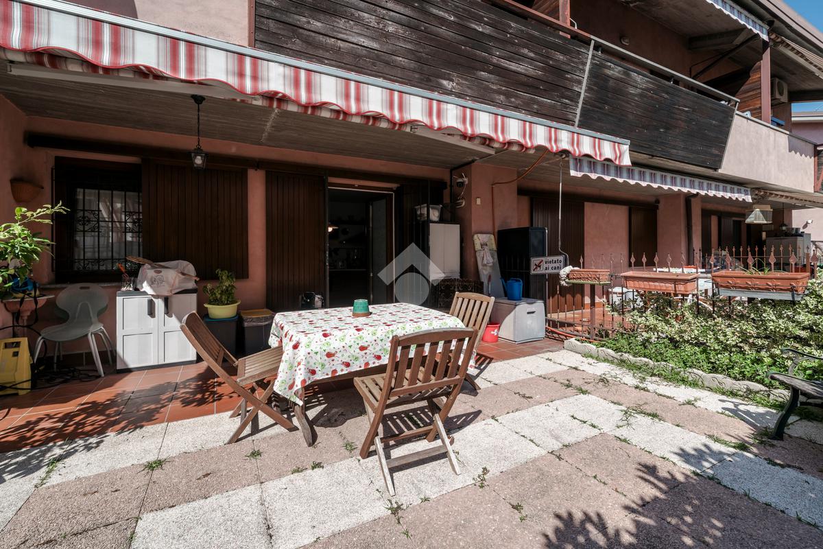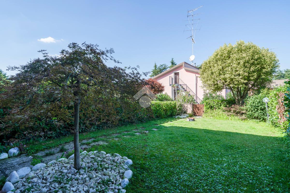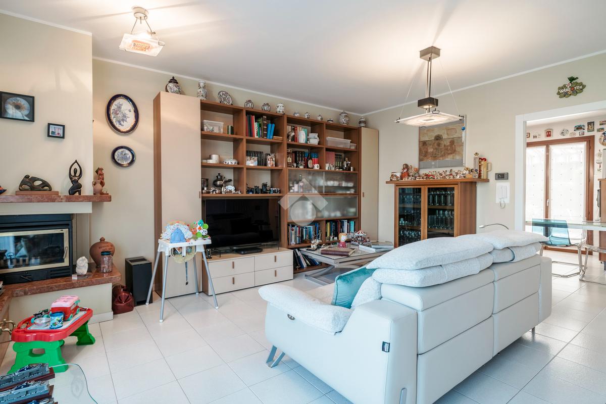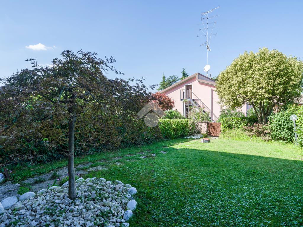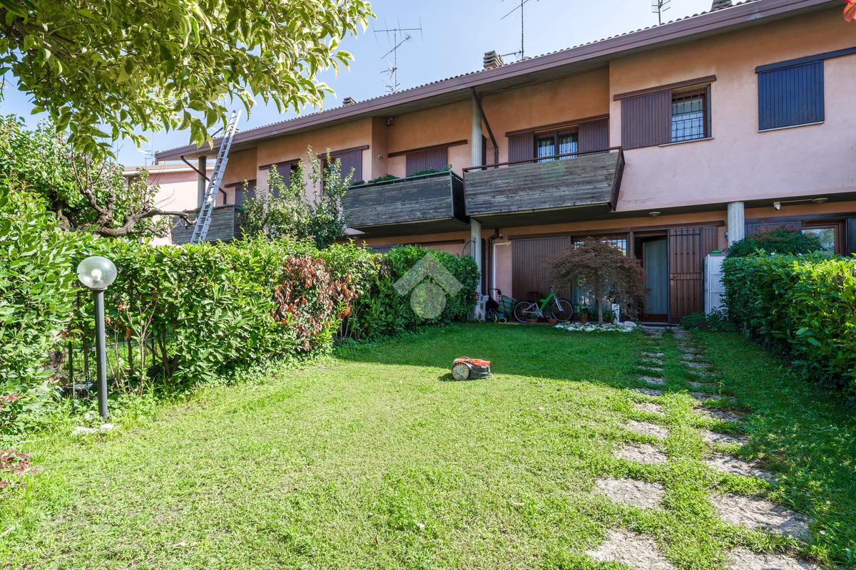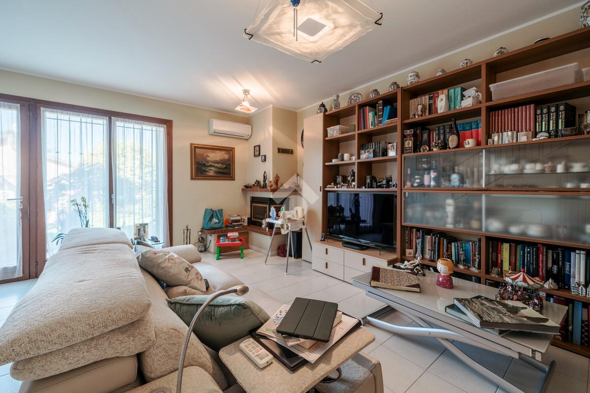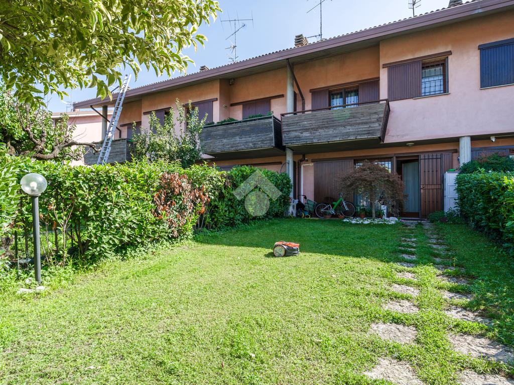 Ubicata in zona comoda al centro, alla stazione, ai negozi, ai supermercati e a tutti i principali servizi, villetta a schiera di recente costruzione con doppia porzione di giardino esclusivo posto sul fronte e sul retro dell' abitazione. Il giardino privato, in particolare, posto sul fronte dell' abitazione è molto spazioso e può ospitare comodamente una piscina. L' ingresso pedonale privato attraversa il giardino e conduce al porticato dal quale si accede all' interno dell' abitazione. Al piano terreno trovano spazio il soggiorno con camino, la cucina abitabile con accesso al porticato ed alla porzione di giardino posto sul retro dell' abitazione e il primo bagno finestrato. Il piano primo ospita la tre camere da letto (tutte dotate di porta finestra con sfogo sui terrazzi posti al piano primo) e il secondo bagno con finestra. Il piano superiore è occupato dalla zona sottotetto in cui è attualmente presente un grande locale open space adibito a camera. Al piano interrato si trovano i due garage, la grande taverna e la lavanderia. L' immobile è stato, di recente, parzialmente ristrutturato. La ristrutturazione ha previsto il rifacimento dei tre servizi, dei serramenti, delle porte interne, del pavimento in due piani dell' abitazione e l' installazione dei pannelli sul tetto.